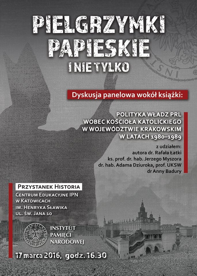 „Papieskie pielgrzymki i nie tylko” – dyskusja panelowa wokół książki: „Polityka władz PRL wobec kościoła katolickiego w województwie krakowskim w latach 1980–1989” z udziałem autora dr. Rafała Łatki, ks. prof. dr. hab. Jerzego Myszora (UŚ), dr. hab. Adama Dziuroka (IPN Katowice/UKSW) i dr Anny Badury (IPN Katowice) odbyła się 17 marca 2016 r. na Przystanku Historia w Katowicach.