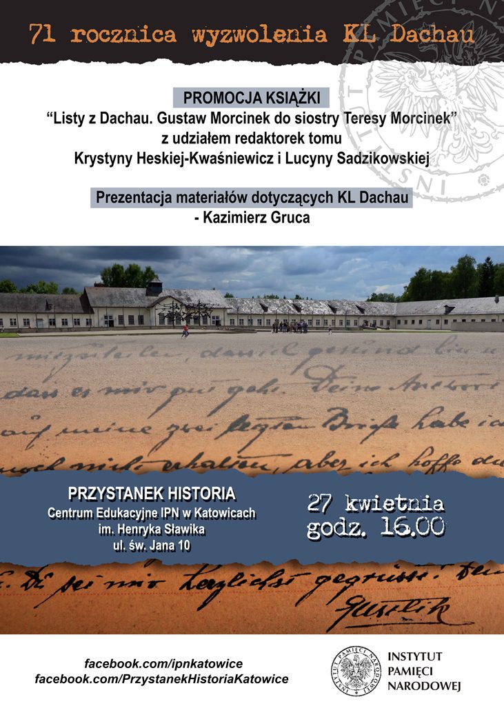 27 kwietnia 2016 r., o godz. 16.00, w Centrum Edukacyjnym IPN w Katowicach „Przystanek Historia” im. Henryka Sławika, przy ul. św. Jana 10, odbędzie się promocja książki „Listy z Dachau. Gustaw Morcinek do siostry Teresy Morcinek” z udziałem redaktorek tomu – Krystyny Heskiej-Kwaśniewicz i Lucyny Sadzikowskiej. Materiały dotyczące KL Dachau zaprezentuje Kazimierz Gruca. Spotkanie odbędzie się z okazji 71. rocznicy wyzwolenia KL Dachau.