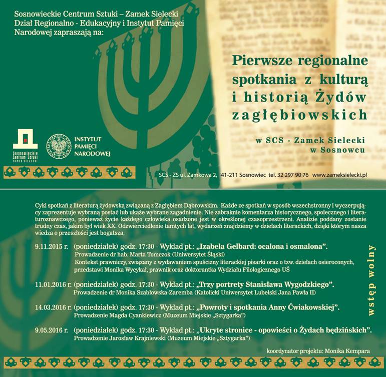 Sosnowieckie Centrum Sztuki – Zamek Sielecki w Sosnowcu oraz Oddział Instytutu Pamięci Narodowej w Katowicach zaprasza na regionalne spotkania z kulturą i historią Żydów zagłębiowskich. Jest to cykl spotkań z literaturą żydowską związaną z Zagłębiem Dąbrowskim. Każde ze spotkań w sposób wszechstronny i wyczerpujący zaprezentuje wybraną postać lub ukaże wybrane zagadnienie. Nie zabraknie komentarza historycznego, społecznego i literaturoznawczego, ponieważ życie każdego człowieka osadzone jest w określonej czasoprzestrzeni. Analizie poddany zostanie trudny czas, jakim był wiek XX. Odzwierciedleniem tamtych lat, wydarzeń znajdziemy w dziełach literackich, dzięki którym nasza wiedza o przeszłości jest bogatsza.