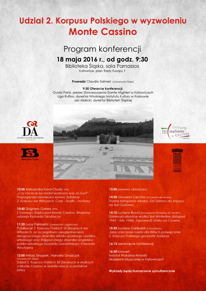 Stowarzyszenie Dante Alighieri w Katowicach we współpracy z Włoskim Instytutem Kultury w Krakowie i Biblioteką Śląską w Katowicach zorganizowały międzynarodową konferencję naukową „Udział 2. Korpusu Polskiego w wyzwoleniu Monte Cassino”. Konferencja odbyła się 18 maja 2016 r., o godz. 9.30, w Bibliotece Śląskiej (pl. Rady Europy 1). Wśród prelegentów byli m.in. pracownicy Oddziału Instytutu Pamięci Narodowej w Katowicach, którzy wygłosili referaty: