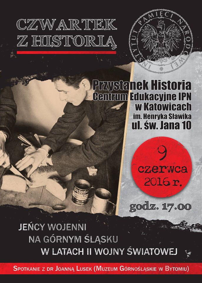 9 czerwca 2016 r., o godz. 17.00, w Centrum Edukacyjnym IPN w Katowicach „Przystanek Historia” im. Henryka Sławika, przy ul. Św. Jana 10, w ramach „Czwartku z historią” odbędzie się wykład „Jeńcy wojenni na Górnym Śląsku w latach II wojny światowej”. Tym razem naszym gościem będzie i wykład wygłosi dr Joanna Lusek, kierownik Działu Historii Muzeum Górnośląskiego w Bytomiu, badaczka m.in. historii wojskowości.