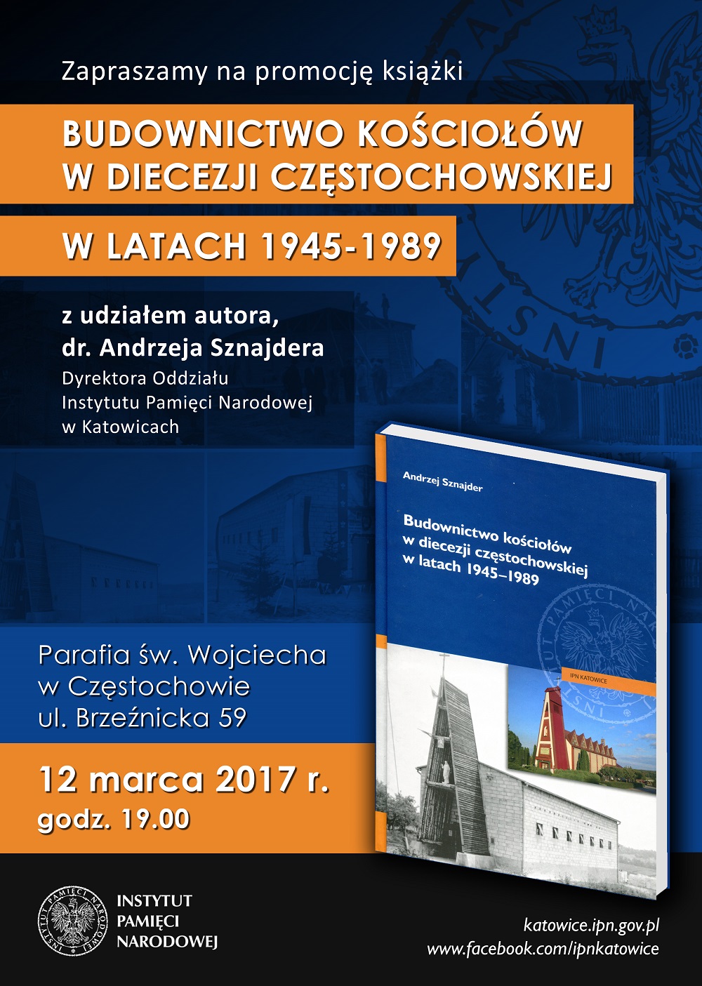 12 marca o godz. 19:00 w Parafii św. Wojciecha  w Częstochowie, przy ul. Brzeźnickiej 59, odbyła się promocja książki Budownictwo kościołów w diecezji częstochowskiej w latach 1945 – 1989 z udziałem autora, dr. Andrzeja Sznajdera, Dyrektora Oddziału Instytutu Pamięci Narodowej w Katowicach.