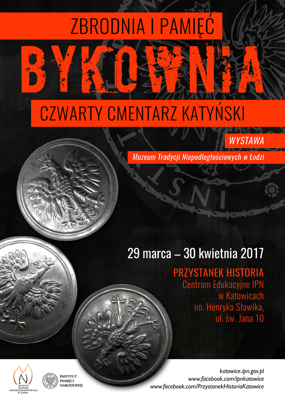 Zapraszamy do zapoznania się z wystawą „Zbrodnia i pamięć. Bykownia – czwarty cmentarz katyński”, która prezentowana jest w Przystanku Historia - Centrum Edukacyjnym IPN w Katowicach im. Henryka Sławika od 29 marca do 30 kwietnia 2017 r. Ekspozycja dotyczy tajnego cmentarza NKWD w Kijowie-Bykowni na Ukrainie, miejsca gdzie grzebano ofiary stalinowskich zbrodni z lat 1937-1941, w tym polskich obywateli z tzw. Ukraińskiej Listy Katyńskiej. Kilkuletnie starania dyplomatyczne umożliwiły w 2001 r. przeprowadzenie w lesie bykowniańskim prac archeologiczno-ekshumacyjnych z udziałem ekspedycji polskiej i ukraińskiej, które kontynuowano w latach 2006, 2007, 2011, 2012. W ich wyniku znaleziono ponad 200 grobów, w tym 70 polskich, z których ekshumowano prawie 2000 polskich ofiar. Zakończenie prac archeologiczno-ekshumacyjnych, oraz uroczyste otwarcie Polskiego Cmentarza Wojennego w Bykowni w 2012 r., stały się inspiracją do otwarcia w 2013 r. w Oddziale Martyrologii Radogoszcz Muzeum Tradycji Niepodległościowych w Łodzi, wystawy pt. „Zbrodnia i Pamięć. Bykownia – czwarty cmentarz katyński”.