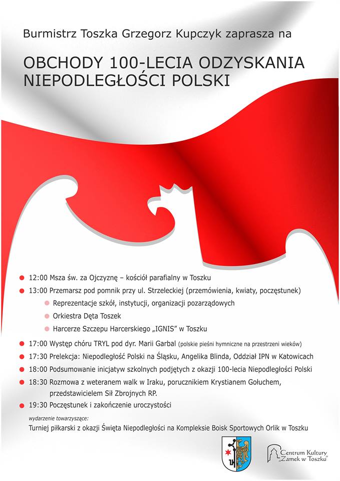 11 listopada 2018 r. w Toszku odbyły się obchody 100-lecia odzyskania przez Polskę niepodległości. Uroczystości rozpoczęła się mszą świętą o godz. 12.00 w kościele parafialnym, po której przedstawiciele władz, szkół, harcerstwa, klubów sportowych oraz wielu innych lokalnych organizacji udali się pod pomnik przy ul. Strzeleckiej. O godz. 17.00 obchody przeniosły się na Zamek, gdzie można było wysłuchać m. in. prelekcji Angeliki Blindy (OBEN IPN Katowice) pt. „Niepodległość Polski na Śląsku”.
