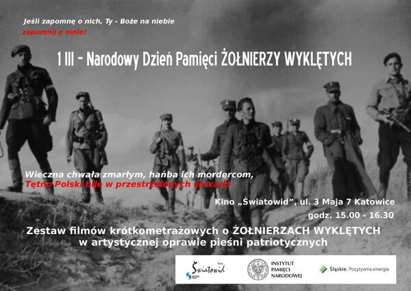 01/03/2013Przegląd filmów krótkometrażowych o Żołnierzach Wyklętych w artystycznej oprawie pieśni patriotycznych w kinie „Światowid” – Katowice, 1 marca 2013