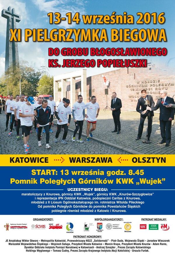 13/09/2016XI Pielgrzymka biegowa do grobu bł. ks. Jerzego Popiełuszki – Katowice – Warszawa, 13–14 września 2016