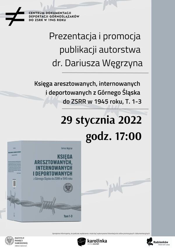 29/01/2022PublikacjePrezentacja książki dr. Dariusza Węgrzyna „Księga aresztowanych, internowanych i deportowanych z Górnego Śląska do ZSRR w 1945 roku” – Radzionków, 29 stycznia 2022