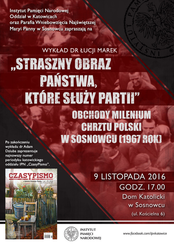 09/11/2016Wykład dr Łucji Marek „<Straszny obraz państwa, które służy partii>. Obchody Milenium Chrztu Polski w Sosnowcu (1967 rok)” oraz prezentacja „CzasyPisma”– Sosnowiec, 9 listopada 2016