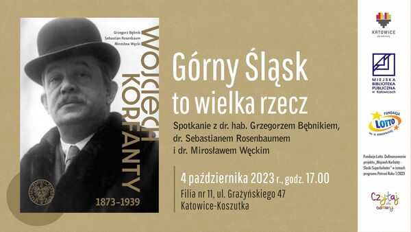 04/10/2023Spotkanie z dr hab. Grzegorzem Bębnikiem, dr. Sebastianem Rosenbaumem i dr. Mirosławem Węckim, autorami książki „Wojciech Korfanty 1873-1939” – Katowice, 4 października 2023