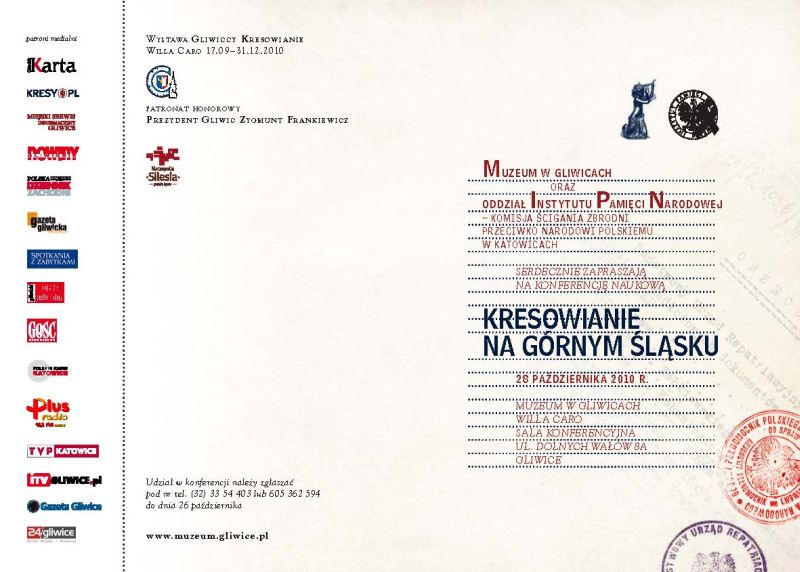 Muzeum w Gliwicach oraz Oddział Instytutu Pamięci Narodowej w Katowicach przygotowały konferencję naukową „Kresowianie na Górnym Śląsku”, która odbyła się 28 października 2010 r. w sali konferencyjnej Willi Caro w Gliwicach, przy ul. Dolnych Wałów 8 a.